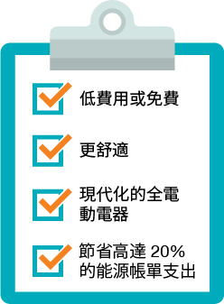 完成調查後,您將獲得一個簡單的計劃,展示您的房屋可以進行哪些升級,例如電磁爐、熱泵(用於加熱和製冷)、熱水器、保溫隔熱材料、管道密封和配電箱升級。